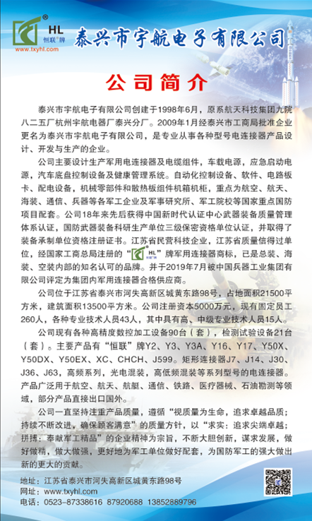 公司位于江蘇省泰興市河失高新區(qū)城黃東路98號(hào),占地面積21500平方米,建筑面積13500平方米。公司注冊(cè)資本5000萬元,現(xiàn)有固定員工260人,各種專業(yè)技術(shù)人員43人,其中具有高、中級(jí)專業(yè)技術(shù)人員15人。公司現(xiàn)有各種高精度數(shù)控加工設(shè)備90臺(tái)(套),檢測試驗(yàn)設(shè)備21臺(tái)(套)。主要產(chǎn)品有【恒聯(lián)牌】Y2、Y3、Y3A、Y16、 Y17、Y50X、Y50DX、Y50EX、 XC、CHCH、J599。 矩形連接器J7、J14、J30、J36、J63,高頻系列,光電混裝,高低頻混裝等系列型號(hào)的電連接器。產(chǎn)品廣泛用于航空、航天、航艇、通信、鐵路、醫(yī)療器械、石油勘測等領(lǐng)域,部分產(chǎn)品直接出口國外。
